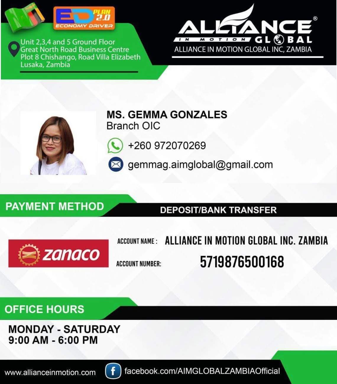Account Name: ALLIANCE IN MOTION GLOBAL INC. ZAMBIA